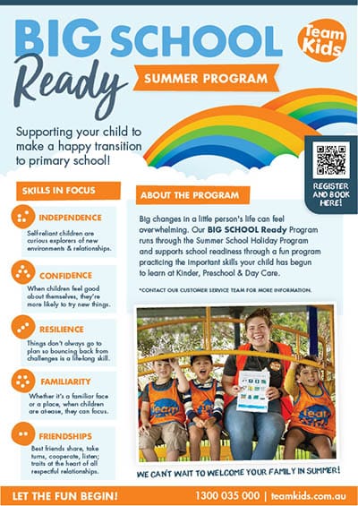 overwhelming. Our BIG SCHOOL Ready Program runs through the Summer School Holiday Program and supports school readiness through a fun program practising the Important skills your child has begun to learn at Kinder, Preschool & Day Care.